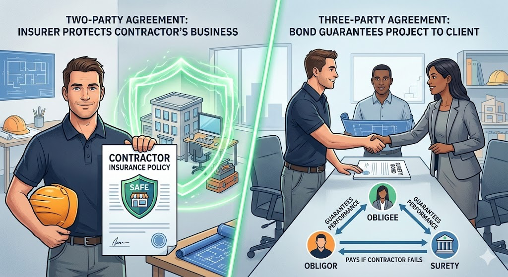 Your general contractor just told you the government project requires both “liability insurance and performance bonds” before you can start the three-million-dollar highway expansion—then casually mentioned the bonds will cost you thirty thousand dollars that you must repay if anything goes wrong, while your insurance agent keeps insisting bonds and insurance are basically the same thing, leaving you completely confused about why you need both products that seem to provide identical financial protection. Understanding the fundamental differences between insurance policies that protect your business from unexpected losses and surety bonds that guarantee your performance to clients could mean the difference between securing lucrative contracts with proper financial planning and losing opportunities because you didn’t prepare for reimbursement obligations that could bankrupt your company if claims occur.