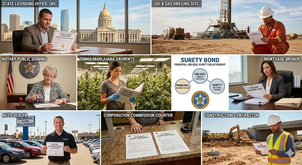 Oklahoma surety bonds create legally binding three-party agreements between principals purchasing bonds, obligees requiring bonds as licensing or regulatory conditions, and surety companies guaranteeing principals’ compliance with Oklahoma statutes, administrative rules, and contractual obligations across dozens of professions and industries. The state requires bonds for notaries posting one thousand dollars for four-year terms, auto dealers securing twenty-five thousand, mortgage brokers bonding one hundred thousand, public adjusters carrying twenty-five thousand, credit services organizations maintaining ten thousand, contractors obtaining five thousand, freight brokers meeting seventy-five-thousand-dollar FMCSA requirements, oil and gas operators providing well plugging security through Form 1006 bonds or fifty-thousand-dollar net worth demonstrations, and medical marijuana commercial growers posting minimum fifty-thousand-dollar bonds per license.
