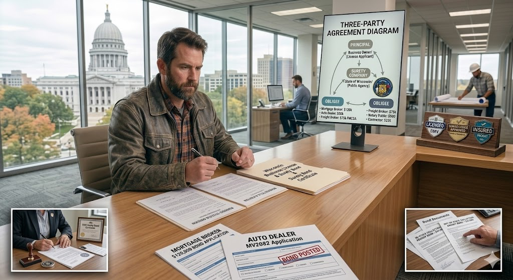 The official letter from Wisconsin’s Department of Safety and Professional Services arrived this morning stating your mortgage broker license application has been approved pending submission of the required one-hundred-twenty-thousand-dollar surety bond within thirty days or your preliminary approval expires, but you’ve never purchased a surety bond before and assumed the dollar amount represented cash you must deposit with the state creating impossible financial requirements you cannot possibly meet, the licensing packet contains confusing references to Wisconsin Statutes Chapter 224 regulations you’ve never encountered during your mortgage training courses, and conflicting online information suggests bond costs might range anywhere from twelve hundred dollars to twelve thousand dollars annually depending on credit scores and underwriting factors you don’t fully understand, leaving you completely uncertain whether you can afford to complete the licensing process or must abandon your mortgage career plans after investing months in prelicensing education and examination preparation. Understanding that Wisconsin mandates surety bonds for dozens of professions and business activities including auto dealers posting up to fifty thousand dollars, collection agencies requiring twenty-five thousand for in-state operations or thirty-five thousand for out-of-state record maintenance, notaries carrying five-hundred-dollar bonds for four-year terms, freight brokers and forwarders obtaining seventy-five-thousand-dollar FMCSA bonds, contractors working public projects securing twenty-five-thousand-dollar performance guarantees, and vehicle owners pursuing bonded titles when original ownership documents go missing, how the three-party principal-obligee-surety agreement structure creates financial protection without requiring full bond amount deposits, what premium calculation formulas based on one to ten percent of bond amounts mean for actual out-of-pocket costs ranging from as little as twenty dollars for notary bonds to several thousand for large commercial obligations, and which Wisconsin-specific statutes, forms, and filing procedures govern each bond category could mean the difference between completing your licensing requirements within weeks at manageable costs or unnecessarily abandoning professional opportunities because you fundamentally misunderstood how surety bonds function and what they actually require financially.
